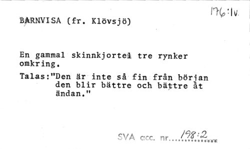//// 1%% //// BARNVISA (fr. Klövsjö) //// En gammal skinnkjortel tre rynker omkring. //// Talas:"Den är inte så fin från början den blir bättre och bättre åt ändan." //// SVA c c c nr ////