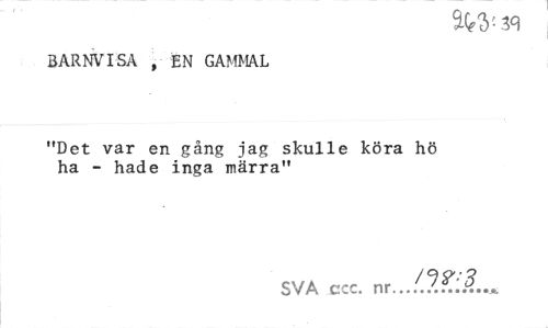 //// BARNVISA , EN GAMMAL //// "Det var en gång jag skulle köra hö ha - hade inga märra" //// SVA ccc. nr../.??:'.?... ////