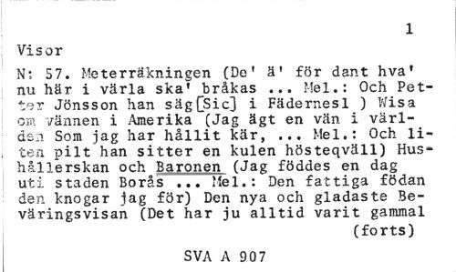 //// 1 //// Visor //// N; 57. Meterräkningen (De" ä' för dant hva' nu här i värla ska* bråkas ... Mel.: Och Petter Jönsson han sägQSic] i Fädernesl ) Wisa om vännen i Amerika (Jag ägt en vän i världen Som jag har hållit kär, ... Mel.: Och liten pilt han sitter en kulen hösteqväll) Hushållerskan och Baronen (Jag föddes en dag uti staden Borås ... Mel.: Den fattiga födan den knogar jag för) Den nya och gladaste Be-väringsvisan (Det har ju alltid varit gammal //// (forts) //// SVA A 907 ////
