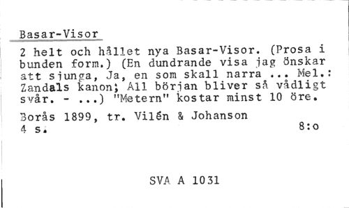 //// Basar-Visor //// 2 helt och hållet nya Basar-Visor. (Prosa i bunden form.) (En dundrande visa jag önskar att sjunga, Ja, en som skall narra ... Mel.: Zandals kanon; All början bliver så vådligt svår. - ...) "Metern" kostar minst 10 öre. //// Borås 1899, tr. Vilén & Johanson 4 s. 8:o //// SVA A 31 33 ////