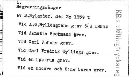 //// r i. //// Begravningssånger //// M im //// | av B.Nyländer. Se: Zz 1859 t //// Vid Å.G.Hyllengrens grav 3/8 185555 cn //// - £ //// 3 Vid Annette Beckmans ferav. //// 3 13 //// ¦ Vid Carl Johans grav. t£2 //// a //// J Vid Carl Fredrik Gyllings grav. ^ //// : v, . „ | //// I Vid en moders och 2:ne barns grav. cd //// k iO ////
