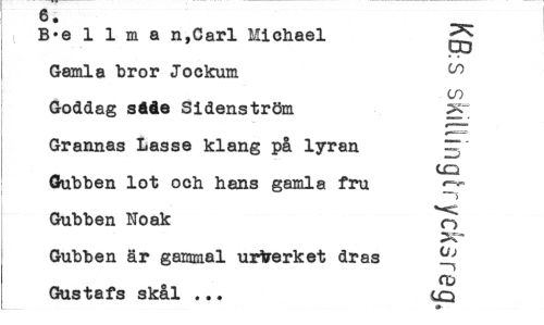 //// 6' //// B«e 1 1 m a n,Carl Michael //// CO //// Gamla bror Jockum ^ //// cn //// Goddag sdåe Sidenström >T //// Grannas Lasse klang på lyran ~' //// to //// Gubben lot ooh hans gamla fru //// i //// Gubben Noak ^ //// Gubben är gammal urtrerket dras ^ //// Gustafs skål ... CQ //// 0< ////