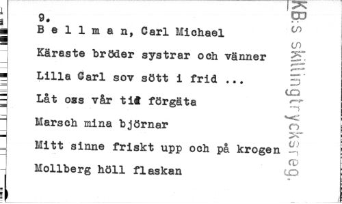 //// 9. IP0 //// ¦ Bellman, Carl Michael 1 //// Käraste bröder systrar och vänner //// ¦ Lilla Carl sov sött i frid ... //// CO //// 2 Låt oas vår tit förgäta //// Marsch mina björnar r> //// Mitt sinne friskt upp och på krogen //// co //// Mollberg höll flaskan cp //// il ////