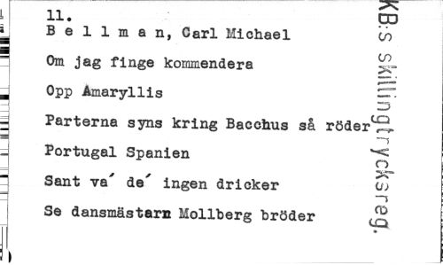 //// 11. pJ //// i Bellman, Carl Michael cö //// 1 co i Om jag finge kommendera //// j Opp Amaryllis //// | Parterna syns kring Bacchus så röder1^ //// m //// j Portugal Spanien ^ //// Sant va de ingen dricker o> //// - —? //// Se dansmästarn Mollberg bröder //// ¦_ ////