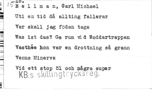 //// B e 1 1 m a n, Carl Michael //// I //// 1 Uti en tid då allting fallerar Var skall jag födan taga Was ist das? Ge rum vid Roddartrappan Vasthee hon var en drottning så grann = Venus Minerve //// Vid ett stop öl och några supar //// KB:S skilUngtrycKsreg, //// ii___ .. ___... ...- ////