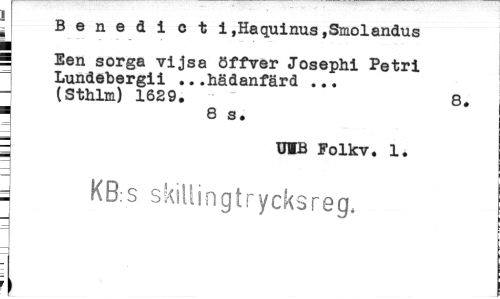 //// | //// i Benedict i»Haquinus,Smolandus ¦ //// | Een sorga vijsa öffver Josephi Petri Lundebergii ...hädanfärd ... (Sthim) 1629. 8. //// * 8 s. //// \ U1B Folkv. 1. //// . KB.s skillingtrycksreg, //// r i ////