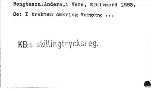 //// Bengtsson.Anders,i Vare, Själmord 1885. Se: I trakten omkring Vargerg ... //// KB.s skillingtrycksreg. ___ ¦ ////