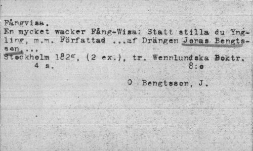 //// Fångvisa. //// F.n mycket vacker Fånp:~Wisa; Statt stilla du Yng-llrsr, Författad .. .af Drängen Jonas^ Bengts- //// s on^ ... //// ^fackholm 1B2e, (2 ex.), tr. Wennlund ska Bektr. 4 s. 8: o //// O Bengtsson, J. ////