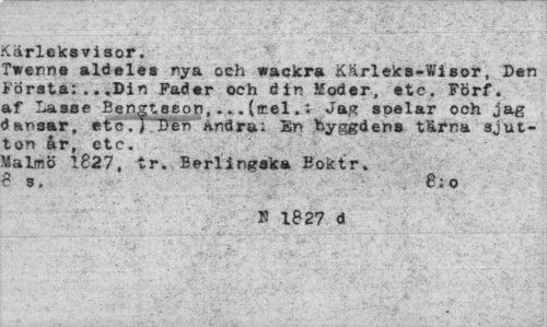 //// kärleksvisor, //// Pwenne aldeles nya och wackra Kärleks-Wisor, Den Första:...Din Fader och din Moder, etc. Förf. af Lasse Bengtsson,... (melJag spelar och jag J ansar, et c. T Den ändra: En "byggd en» tärna sjutton år, etc. //// Malmö 1827, tr. Berlineaka Bofctr. 8 s. . 8:0 //// 4 1827 d ////