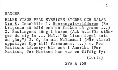 //// 1 //// SÅNGER //// ELLER VISOR FRÄN SVERIGES BYGDER OCH DALAR N:o 8. Innehåll: 1. Benrangels-riddaren (En krigsman så båld och en fröken så grann ..») 2. Enslingens sång i buren (Ack hvarför stänger du mig in ... Mel.:"En liten fogel satt en gång") 3. 0, du min Waldemar! (När vårsol uppstiger Upp till firmament, ...) 4. Per Mattsons äfventyr här och i Amerika (Per Mattson, Per Mattson han var en fiffig fyr //// (forts) //// SVA A 269 2 ////