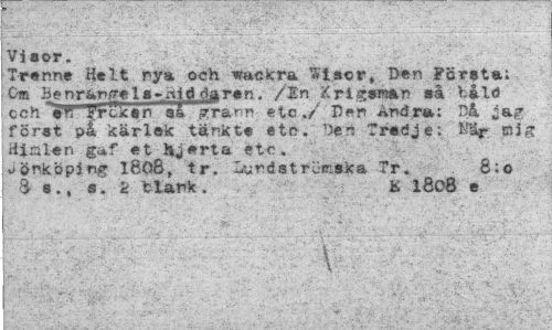 //// Viaor. //// Trenne Helt rya och wackra «iscr, Den Första; Om BenrangeIs-Mft.äaren, /'En Krigsman så båld cch\rr- Jfroxtn sa grann etc./ Den Andra; Då jag förat j>& kärlek tänkte etc. T>én Tredje; mig //// äiulen gaf et hjerta etc. //// Jönköping I808, tr. Lunds traska Tr. 8:0 //// a e., s. < fclank. K 1808 e //// \ \ ; ////