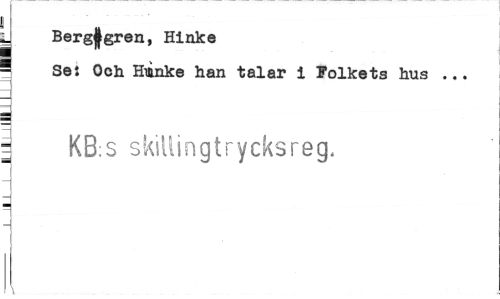 //// y Berg|gren, Hinke //// ¦ Se: Och Hmnke han talar i Folkets hus ... //// 1 //// | KB:S skillingtrycksreg. //// \ ////