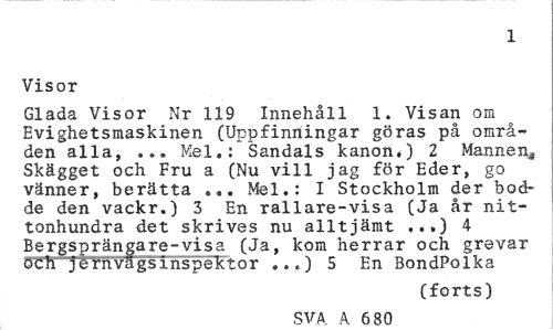 //// 1 //// Visor //// Glada Visor Nr 119 Innehåll 1. Visan om Evighetsmaskinen (Uppfinningar göras på områden alla, ... Mel.: Sandals kanon*) 2 Mannenä Skägget och Fru a (Nu vill jag för Eder, go vänner, berätta ... Mel.: I Stockholm der bodde den vackr.) 3 En rallare-visa (Ja år nittonhundra det skrives nu alltjämt ...) 4 Bergsprängare-visa (Ja, kom herrar och grevar OCh jérnvågsinspektor ...) 5 En BondPolka //// (forts) //// SVA A 680 ////