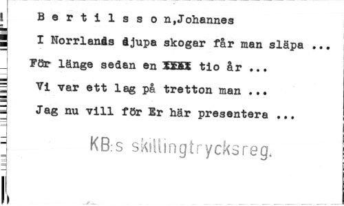 //// ! B e r t i 1 s s o n,Johannes //// l I Norrlanås åjupa skogar får man släpa ... //// För länge sedan en 5ESX tio år ... //// | Vi var ett lag på tretton man ... //// ¦ Jag nu vill för Er här presentera ... //// ] KB:s skillingtrycksreg, //// 1 //// ii ////