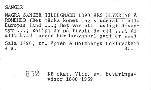 //// SÅNGER //// NÅGRA SÅNGER TILLEGNADE 1890 ÅRS BEVÄRING Ä ROMEHED (Det täcka könet jag studerat i alla Europas land ...; Det var ett lustigt äfven-tyr Roligt är på Tivoli Se ett Af //// allt hvad jorden bär besynnerligast är ...) //// Sala 1890, tr. Ågren & Holmbergs Boktryckeri 4 s. 8:o //// c-qo KB okat. Vitt. sv. bevärings- //// visor 1880-1939 ////
