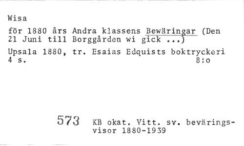 //// Wisa //// för 1880 års Andra klassens Bewäringar (Den 21 Juni till Borggården wi gick ...) //// Upsala 1880, tr. Esaias Edquists boktryckeri 4 s. 8 : o //// 573 KB okat. Vitt. sv. bevärings- //// visor 1880-1939 ////