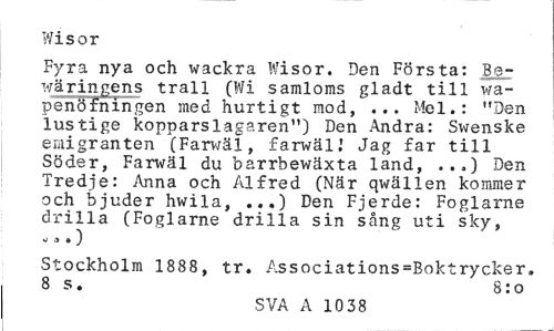 //// Wisor //// Fyra nya och wackra Wisor. Den Första: Be-wäringens trall (Wi samloms gladt till wa-penöfningen med hurtigt mod, ... Mel.: "Den lustige kopparslagaren") Den Andra: Swenske emigranten (Farwäl, farwäl.' Jag far till Söder, Farwäl du barrbewäxta land, ...) Den Tredje: Anna och Alfred (När qwällen kommer och bjuder hwila, ...) Den Fjerde: Foglarne drilla (Foglarne drilla sin sång uti sky, //// ¦J S » ) //// Stockholm 1888, tr. Associations=Boktrycker. //// 8 s. 8:0 //// SVA A 10 38 ////
