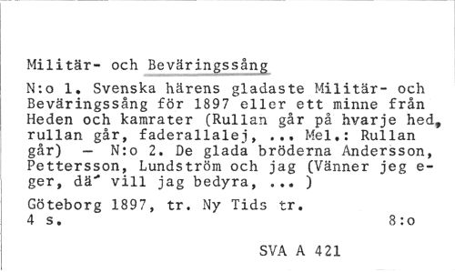 //// Militär- och Beväringssång //// N:o 1. Svenska härens gladaste Militär- och Beväringssång för 1897 eller ett minne från Heden och kamrater (Rullan går på hvarje hed, rullan går, faderallalej, ... Mel,: Rullan går) - N:o 2. De glada bröderna Andersson, Pettersson, Lundström och jag (Vänner jeg e-ger, dä" vill jag bedyra, ... ) //// Göteborg 1897, tr. Ny Tids tr. //// 4 s. 8 : o //// SVA A 421 ////