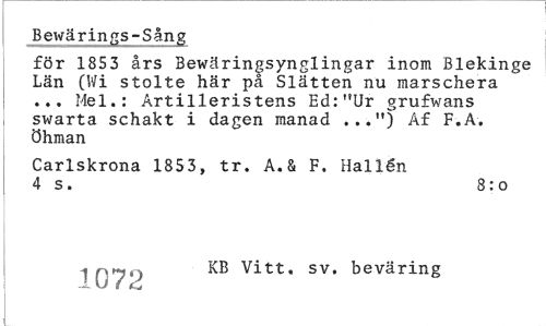 //// Bewärings-Sång //// för 1853 års Bewäringsynglingar inom Blekinge Län (Wi stolte här på Slätten nu marschera ... Mel.: Artilleristens Ed:"Ur grufwans swarta schakt i dagen manad . ..") Af F.A. öhman //// Carlskrona 1853, tr. A.& F. Hallén 4 s. 8:o //// KB Vitt, sv. beväring ////