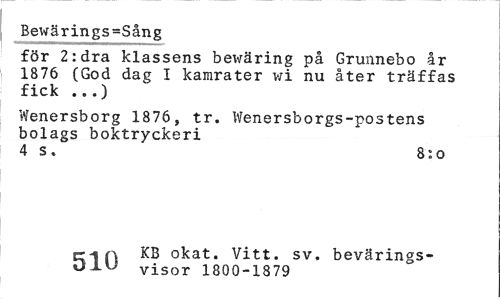 //// Bewärings=Sång //// för 2: dra klassens bewäring på Grunneho år 1876 (God dag I kamrater v/i nu åter träffas fick ...) //// Wenersborg 1876, tr. Wenersborgs-postens bolags boktryckeri //// 4 s. 8:o //// cr-in okat. Vitt. sv. bevärings- //// O-LU visor 1800-1879 ////