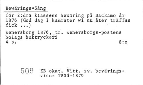 //// Bewärings=Sång //// för 2rdra klassens bewäring på Backamo år 1876 (God dag I kamrater wi nu åter träffas fick ...) //// Wenersborg 1876, tr. Wenersborgs-postens bolags boktryckeri //// 4 s. 8:o //// 50P okat. Vitt. sv. bevärings- //// visor 1800-1879 ////