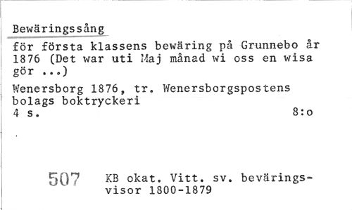 //// Bewäringssång //// för första klassens bewäring på Grunnebo år 18 76 (Det war uti Maj månad wi oss en wisa gör ...) //// Wenersborg 1876, tr, Wenersborgspostens bolags boktryckeri //// 4 s. 8: o //// 747 KB okat. Vitt. sv. bevärings- //// visor 1880-1939 ////