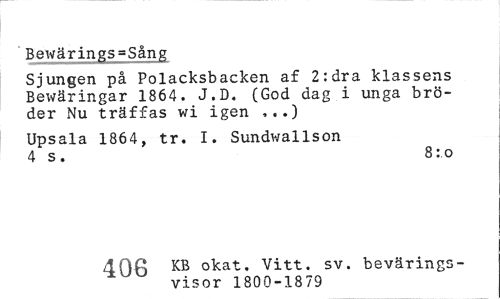 //// Bewärings=Sång //// Sjungen på Polacksbacken af 2:dra klassens Bewäringar 1864. J.D. (God dag i unga bröder Nu träffas wi igen ,..) //// Upsala 1864, tr. I. Sundwallson 4 s. 8:.o //// 40£) KB okat. Vitt. sv. bevärings- //// visor 1800-1879 ////