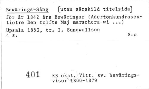 //// Bewärings=Sång [utan särskild titelsida] //// för år 1842 års Bewäringar (Adertonhundrasex-tiotre Den tolfte Maj marschera wi ...) //// Upsala 1863, tr. I, Sundwalison 4 s , 3: o //// 747 KB okat. Vitt. sv. bevärings- //// visor 1880-1939 ////