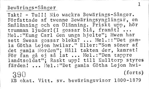 //// Be\tfärings = 5ånger 1 //// Takt! - Tu!!! Nio wackra Bewärings-Sånger. Författade af twenne Bewäringsynglingar, en Smålänning och en ölänning. Friskt upp, hör trumman ljuder!(I gossar blå, framåt! ... Mel.:"Kung Carl den unga hjelte"; Hwem har sett Sweas gossar bleka? ... Mel.::"Det gamla Götha Lejon hwilar." Eller:"Som söner af det gamla Norden"; Håll takten der, kamrat! För fan gå ej så lat ... Mel.:"Den tappre landtsoldat"; Raskt upp! till Kulltorp styres färden! ... Mel.:"Det gamla Götha Lejon hwi- //// 390 (forts) //// KB okat. Vitt. sv. beväringsvisor 1800-1379 ////