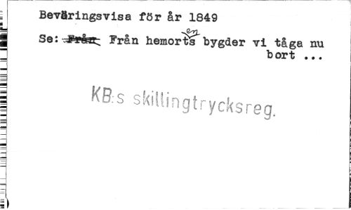 //// Beväringsvisa för år 1849 y ^ri //// | Se: Från hemorts bygder vi tåga nu //// -j b ort ... //// | KB.s skillingtrycksreg. ////