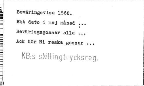 //// r //// j; Beväringsvisa 1862. //// zj Ett dato i maj månad ... //// Beväringsgossar alla ... //// i Ack hör Ni raska gossar ... //// 1 KB:s skillingtrycksreg, //// H //// —i ////
