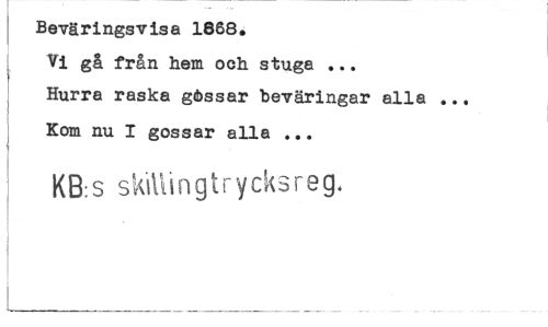 //// Beväringsvisa 1868* Vi gå från hem och stuga ... Hurra raska gössar beväringar alla ... Kom nu I gossar alla ... //// KB:S skilt i n gir y eks re g. ////