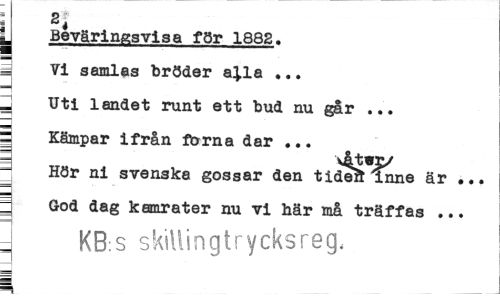//// i-— - ~ fa Vi samlas bröder a^la ... _ Uti landet runt ett bud nu gar ... g Kämpar ifrån forna dar ... //// Hör ni svenska gossar den tide!t inne är •.. God dag kamrater nu vi här må träffas ... //// ] KB:s skillingtrycksreg. ////
