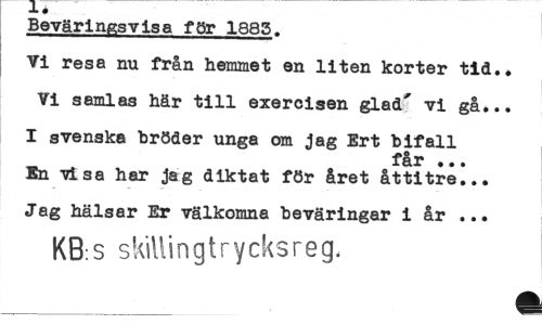 //// X. //// Beväringsvisa far 1885. //// Vi resa nu från hemmet en liten korter tid.. //// VI samlas här till exercisen glad' vi gå... //// I svenska bröder unga om jag Ert bifall //// får ... //// En visa har jag diktat för året åttitre... Jag hälsar Er välkomna beväringar i år ... //// KB:S skiliingtrycksreg. //// fl ////