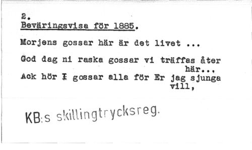 //// 2. //// Beväringsvisa far 1885. //// Morjens gossar här är det livet ... //// God dag ni raska gossar vi träffas åter //// här.., //// Ack hör I gossar alla för Er jag sjunga //// vill, //// KB.s sk\Uingtrycksreg. ////