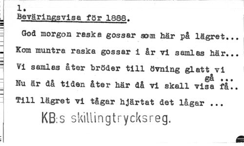 //// 1. //// Beväringsvisa för 1888. //// God morgon raska gossar som här på lägret... //// Kom muntra raska gossar i år vi samlas här... //// Vi samlas åter bröder till övning glatt vi //// gå ... //// Nu är då tiden åter här då vi skall visa få.. : Till lägret vi tågar hjärtat det lågar ... //// KB:S skiUingtrycksreg, ////