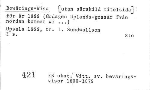 //// ,Bewärings=Wisa j~utan särskild titelsidaJ //// för år 1866 (Godagen Uplands-gossar från nordan kommer wi ...) //// Upsala 1866, tr. I. Sundwallson 2 s. 8:o //// 379 KB okat. Vitt. sv. bevärings- //// vi.sor 1800-18 79 ////