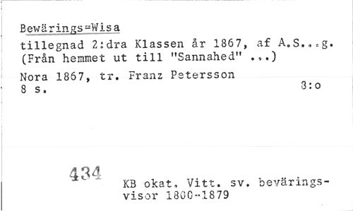 //// Bewärings-Wisa //// tillegnad 2: dra Klassen år 1867, af A.S.,»g. (Från hemmet ut till "Sannahed" ,,.) //// Nora 1867, tr. Franz Petersson 8 s, 3: o //// 434 //// KB okat. Vitt. sv. bevärings- //// visor 1800-1879 ////