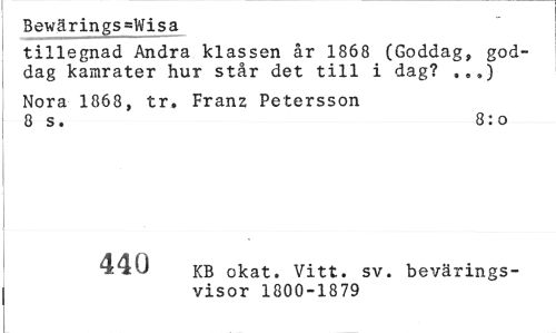 //// Bewärings=Wisa //// tillegnad Andra klassen år 1868 (Goddag, goddag kamrater hur står det till i dag? ,..) //// Nora 1868, tr. Franz Petersson 8 s. 8:o //// z-r>n KB okat. Vitt. sv. bevärings //// visor 1800-1879 ////