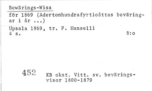//// Bewärings-Wisa //// för 1869 (Adertonhundrafyrtioåttas beväring-ar i år ,..) //// Upsala 1869, tr, P. Hanselli 4 s. 8: o //// ^ •''• KB okat, Vitt, sv. bevärings- //// visor 1800-1879 ////