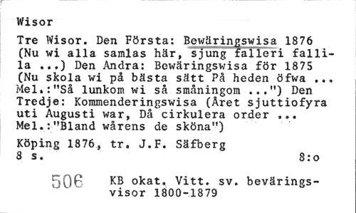 //// Wisor //// Tre Wisor. Den Första: Bewäringswisa 1876 (Nu wi alla samlas här, sjung falleri fallila ..,) Den Andra: Bewäringswisa för 1875 (Nu skola wi på bästa sätt På heden öfwa ... Mel*:"Så lunkom wi så småningom ...") Den Tredje: Kommenderingswisa (Aret sjuttiofyra uti Augusti war, Då cirkulera order ... Mel.:"Bland wårens de sköna") //// Köping 1876, tr. J.F. Säfberg 8 s. 8: o //// 379 KB okat. Vitt. sv. bevärings- //// vi.sor 1800-18 79 ////