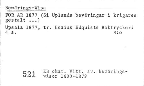 //// Bewärings=Wisa //// FÖR ÄR 1877 (Si Uplands beväringar i krigares gestalt ...) //// Upsala 1877» tr. Esaias Edquists Boktryckeri 4 s. 8:o //// J77 KB okat, Vitt. sv. bevärings- //// - : ' visor 1800-1879 ////