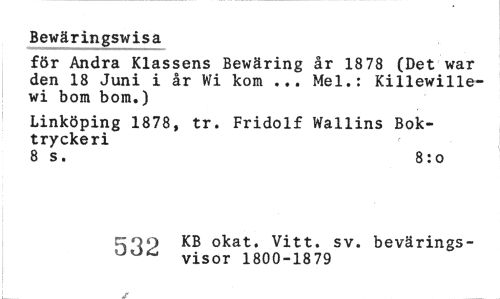 //// Bewäringswisa //// för Andra Klassens Bewäring år 1878 (Det war den 18 Juni i år Wi kom ... Mel.: Killewille-wi bom bom.) //// Linköping 1878, tr. Fridolf Wallins Boktryckeri //// 8 s. 8:o //// r:op KB okat. Vitt. sv. bevärings- //// visor 1800-1879 ////