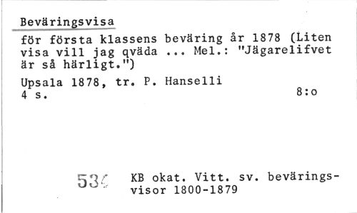 //// Beväringsvisa //// för första klassens beväring år 1878 (Liten visa vill jag qväda ... Mel.: "Jägarelifvet är så härligt.") //// Upsala 1878, tr. P. Hanselli 4 s. 8:o //// r. „ 0 KB okat. Vitt. sv. bevärings- //// b4o visor 1800-1879 ////