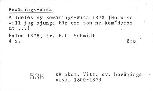 //// Bewärings-Wisa //// Alldeles ny Bewärings-Wisa 18 78 (En wisä will jag sjunga för oss som nu kem"*deras ut ...) //// Falun 1878, tr. F.L. Schmidt 4 s. 8:o //// crcrn KB okat. Vitt. sv. bevärings- //// visor 1800-1879 ////