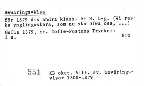 //// Bewärings*Wisa //// för 1879 års andra klass. Af E. L-g. (Wi raska ynglingaskara, som nu ska öfwa oss, ...) //// Gefle 1879, tr. Gefle-Postens Tryckeri 2 s. 8:o //// crcrn KB okat. Vitt. sv. bevärings- //// visor 1800-1879 ////