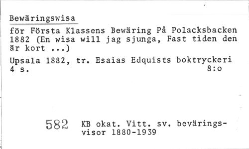 //// Bewäringswisa //// för Första Klassens Bewäring På Polacksbacken 1882 (En wisa will jag sjunga, Fast tiden den är kort ...) //// Upsala 1882, tr. Esaias Edquists boktryckeri 4 s . 8: o //// 582 KB okat. Vitt. sv. bevärings- //// visor 1880-1939 ////