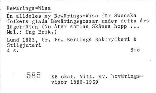//// Bewärings=Wisa //// En alldeles ny Bewärings=Wisa för Swenska folkets glada Bewäringsgossar under detta års lägermöten (Nu åter samlas Skånes hopp ... Mel.: Ung Erik.) //// Lund 1882, tr. Fr. Berlings Boktryckeri & Stilgjuteri //// 4 s. 8:0 //// 585 KB okat. Vitt. sv. bevärings- //// visor .1880-1939 ////
