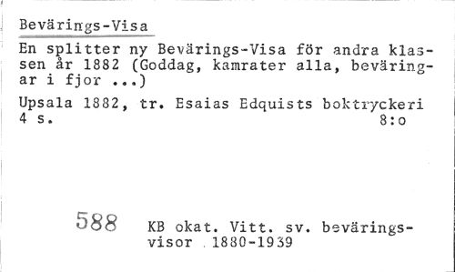 //// Bevärings-Visa //// En splitter ny Bevärings-Visa för andra klassen år 1882 (Goddag, kamrater alla, beväring-ar i fjor ...) //// Upsala 1882, tr. Esaias Edquists boktryckeri 4 s. 8:o //// 588 KB okat. Vitt. sv. bevärings- //// visor .1880-1939 ////