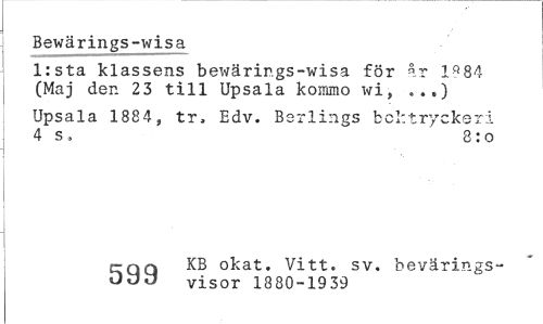 //// Bewärings-wisa //// l:sta klassens bewärings-wisa för år lft84 (Maj den 23 till Upsala kommo wi, . .,) //// Upsala 1884, tr, Edv. Berlings boktryckeri 4 s. 8:o //// rQQ KB okat. Vitt. sv. bevärings- //// Oay visor 1880-1939 ////